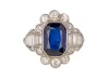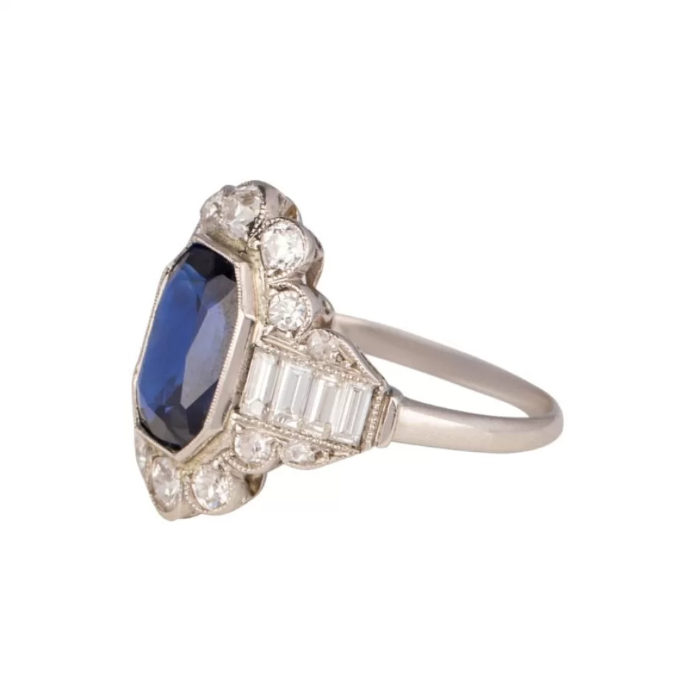The Sapphire is surrounded by round and baguette Diamonds in a mix