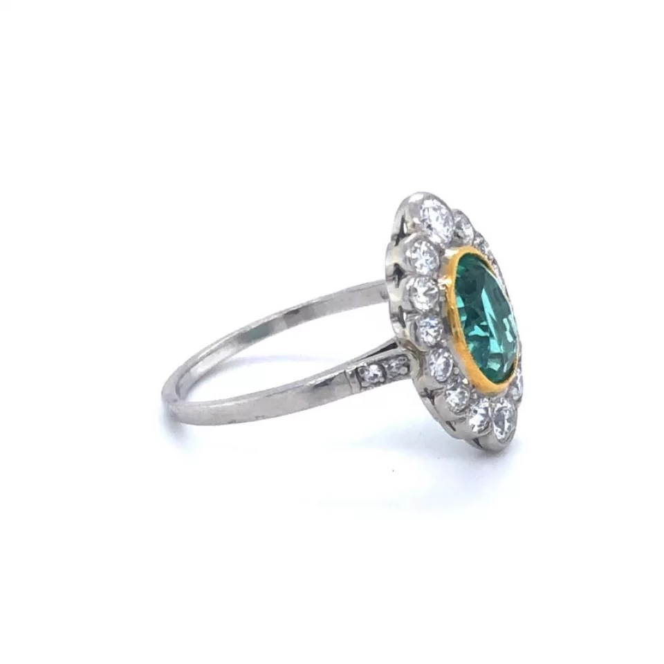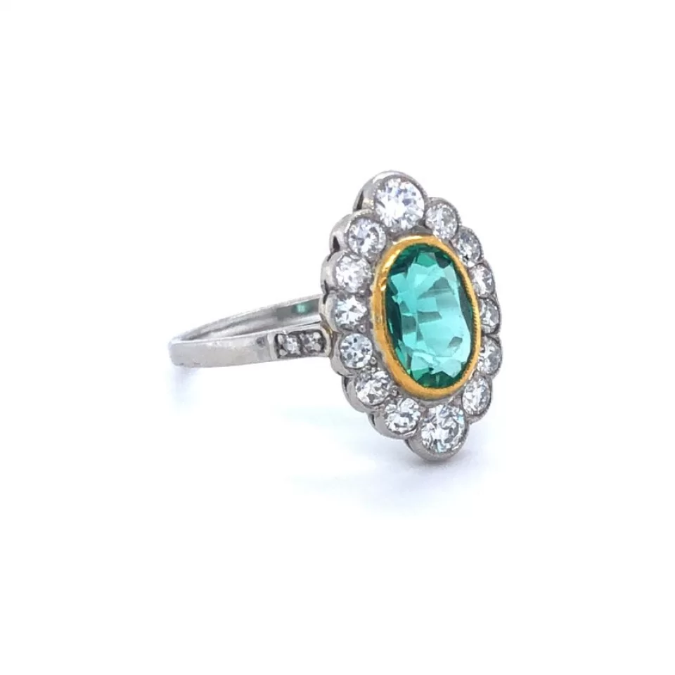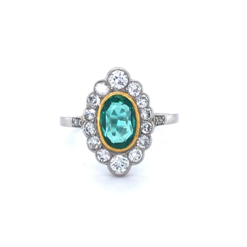 Art Deco 18ct Gold & Platinum Oval Emerald & Diamond Cluster Ring.