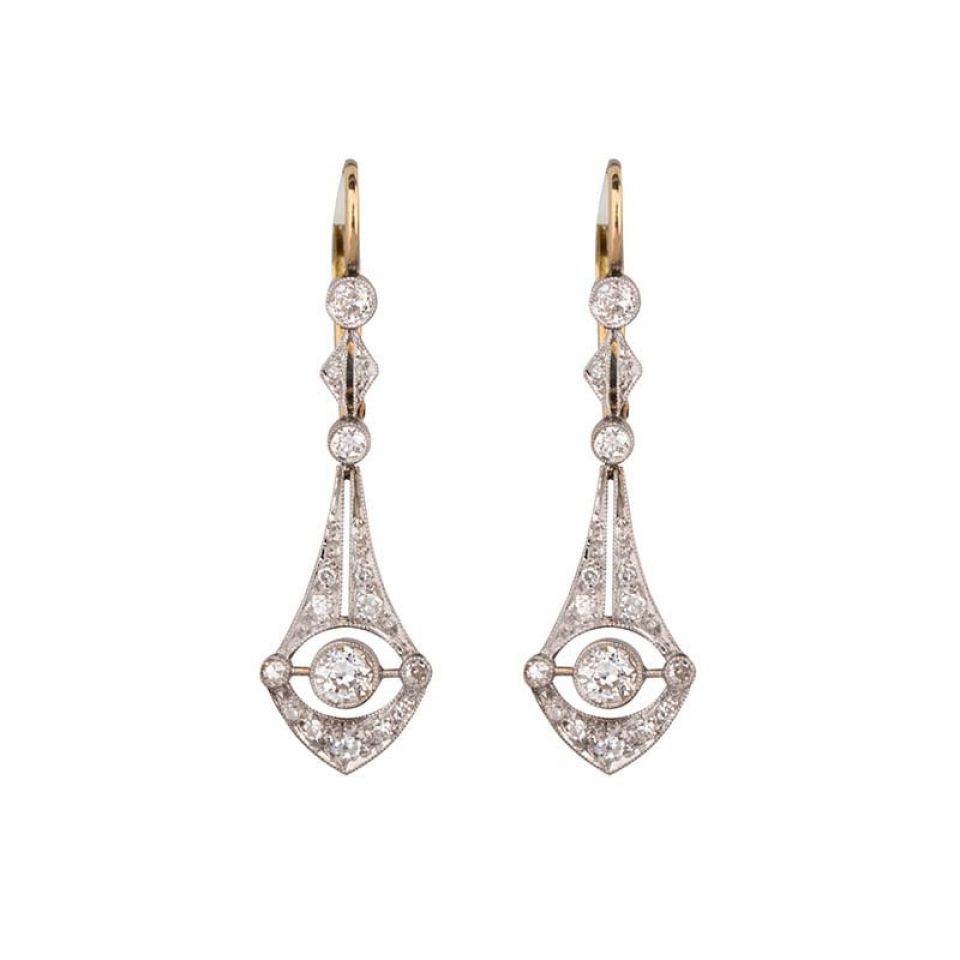 Handmade Art Deco Antique 18ct Yellow Gold & White Gold Teardrop Diamond Earrings.
