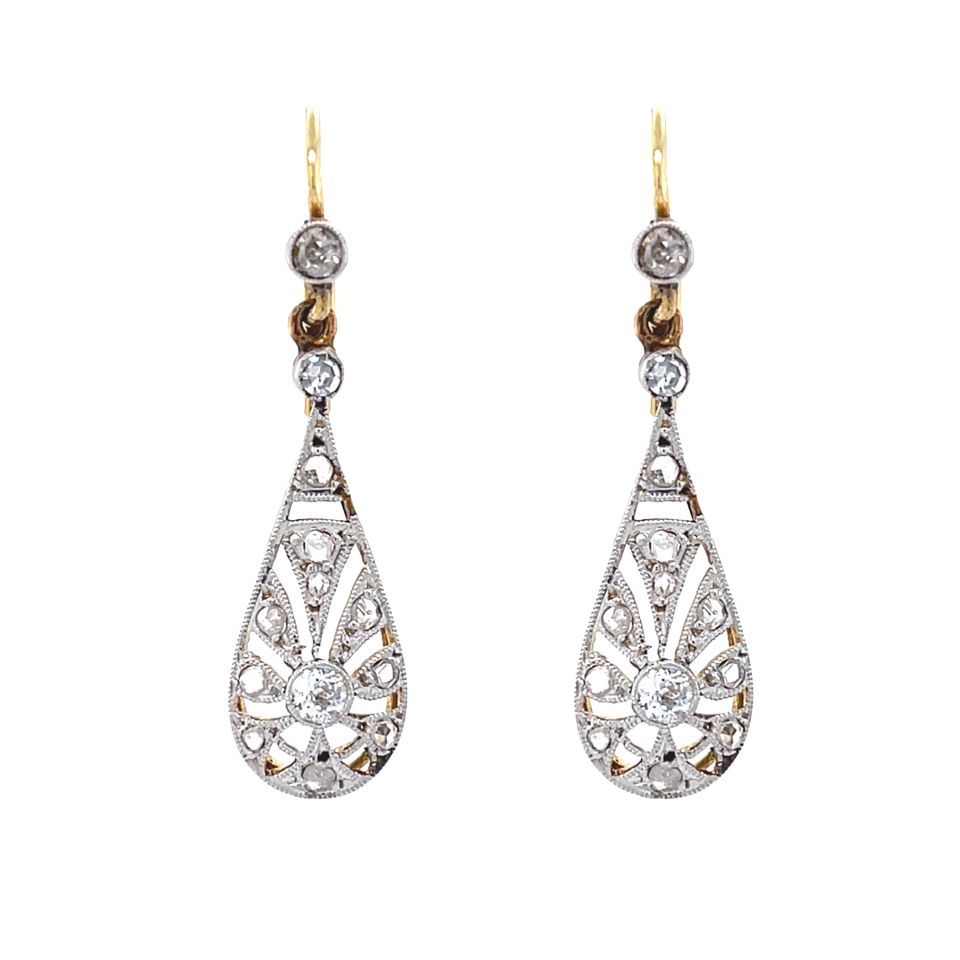 Art Deco Handmade 18ct Yellow Gold & Platinum Tear Drop Design Diamond Drop Earrings.