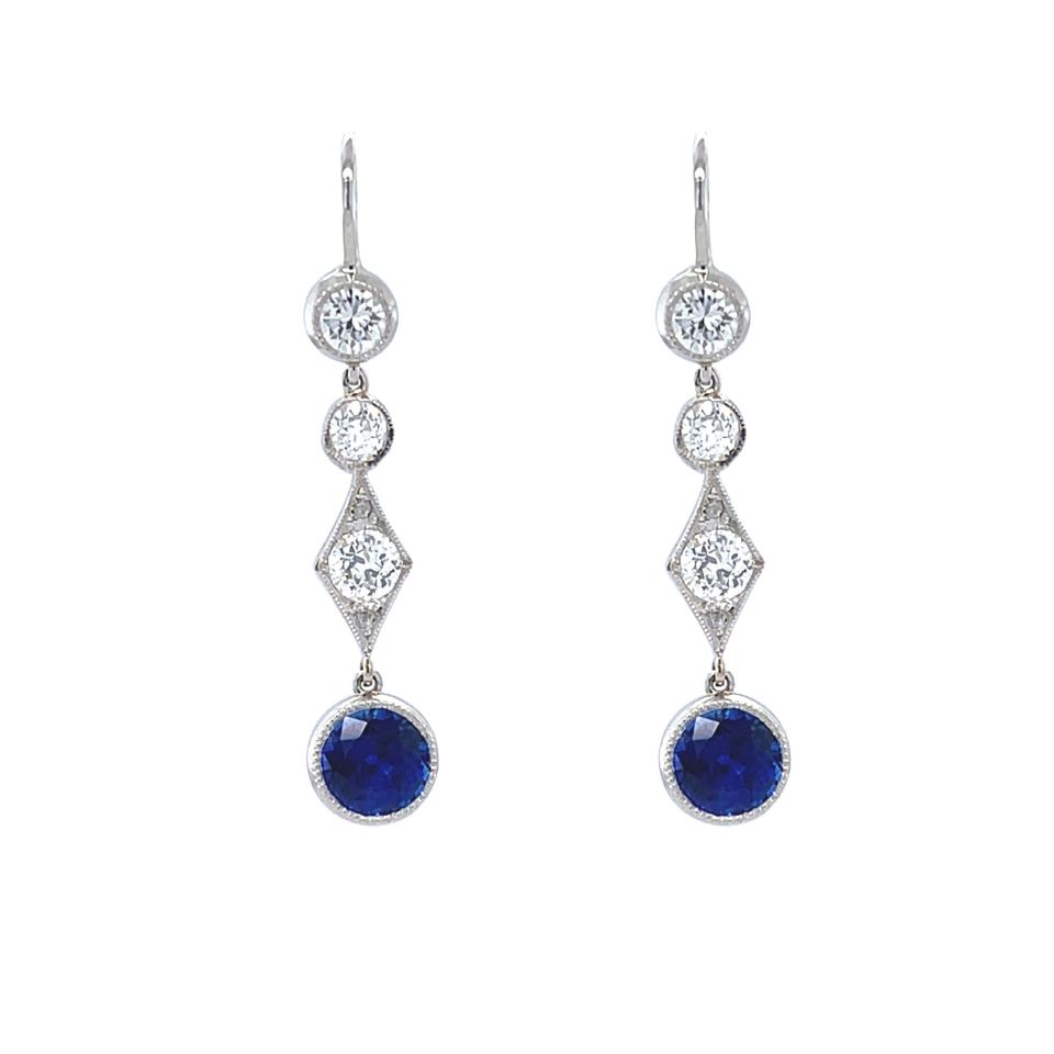 Art Deco Handmade Platinum Set Sapphire & Old European Cut Diamond Drop Earrings.