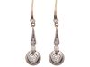Elegant original Handmade Art Deco Circular Diamond Drop Earrings set in 14ct Yellow Gold and Platinum. The top section features a single Diamond set into a full rub-over. Suspended from this is a long drop that has two grain set Diamonds. At the base of these are two Diamonds of which one is set into a single rub-over and the larger lower diamond is set into a double rub-over setting.