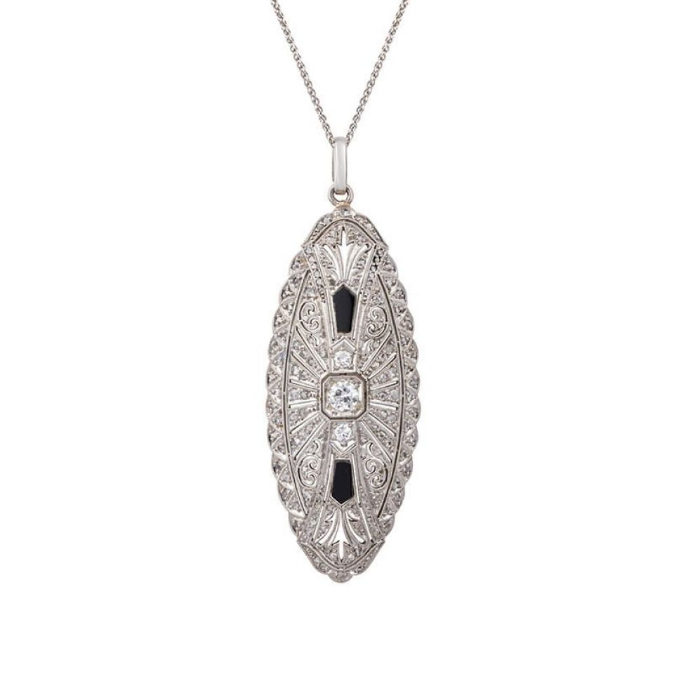 Art Deco antique 18ct White Gold and Platinum Onyx and Diamond Oval Pendant.