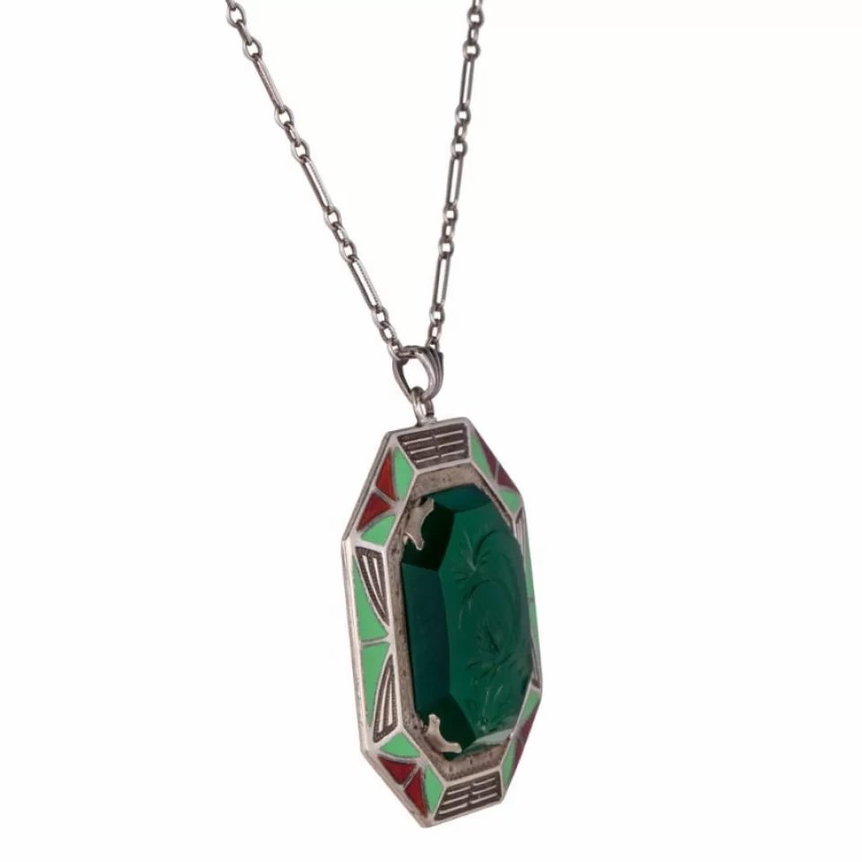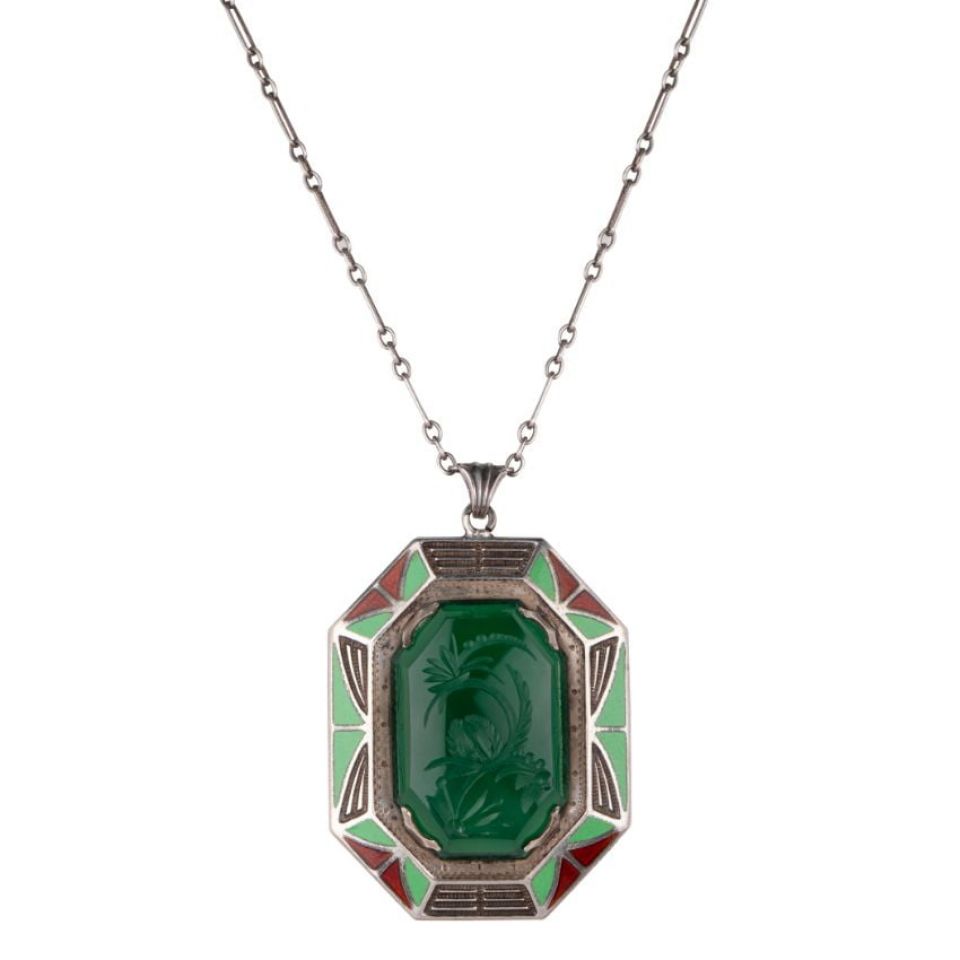 Original Art Deco Silver, Enamel And Carved Chalcedony Pendant On Silver Chain.