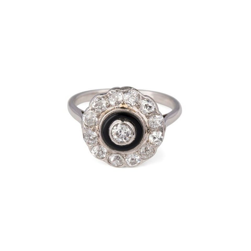 Original Art Deco 18ct White Gold Diamond & Onyx Daisy Cluster Ring