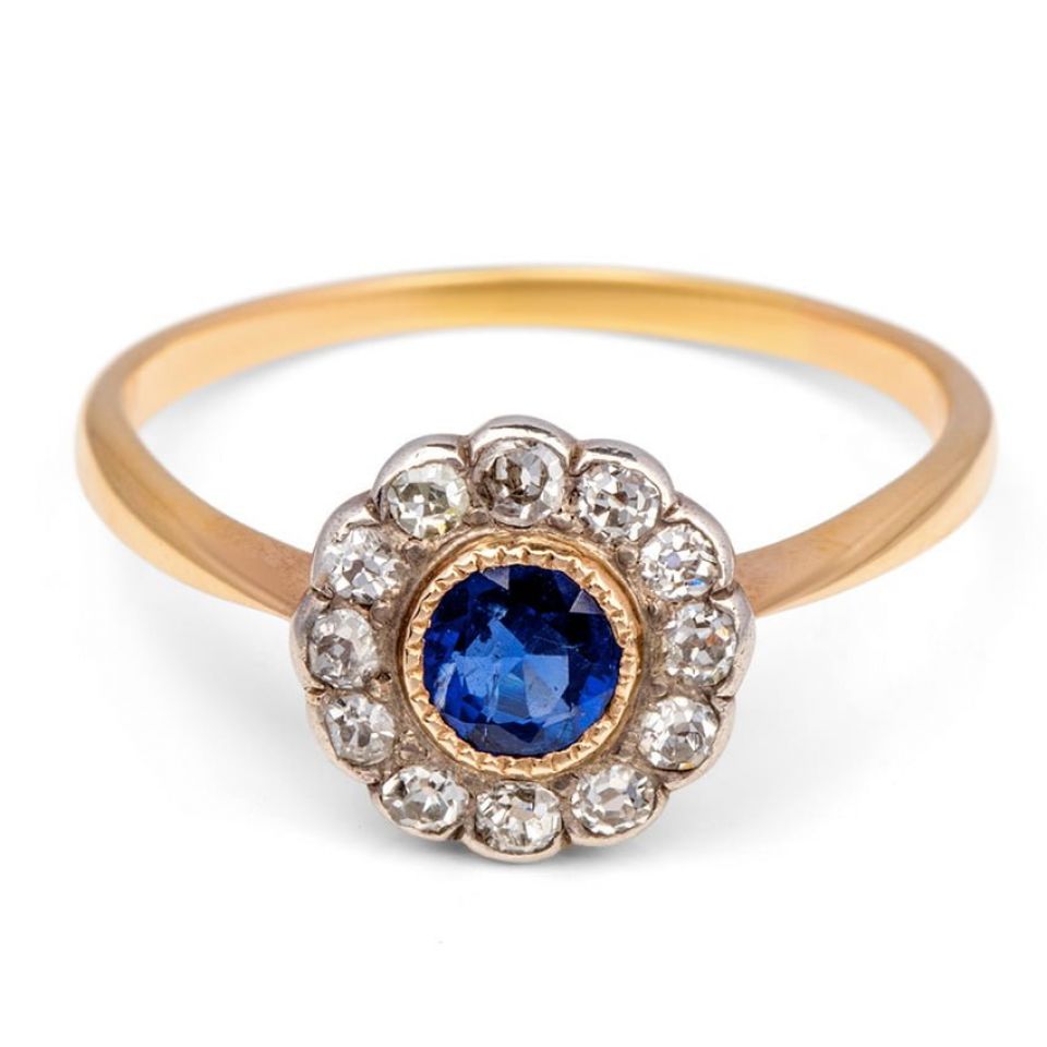 Art Deco 18ct Yellow and White Gold Sapphire and Diamond Daisy Cluster Ring c1920s.