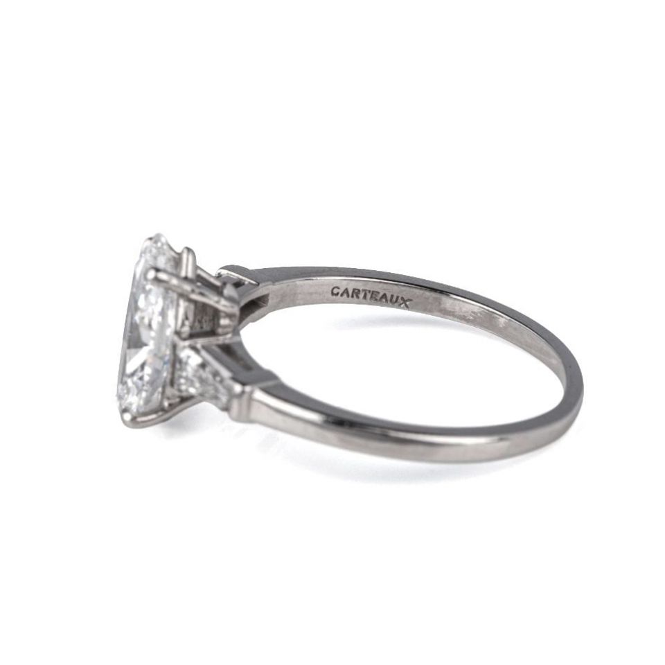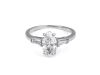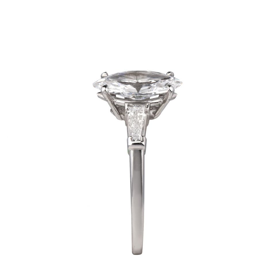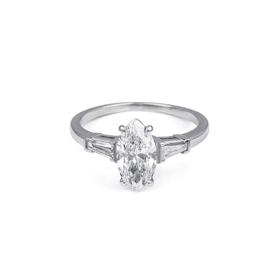 The claw set Marquise = 1.29ct E VS1 and has 2 side Tapered Baguette