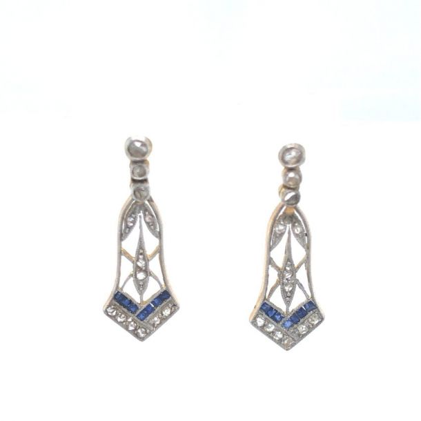 ART DECO HANDMADE PLATINUM SAPPHIRE & DIAMOND DROP EARRINGS
