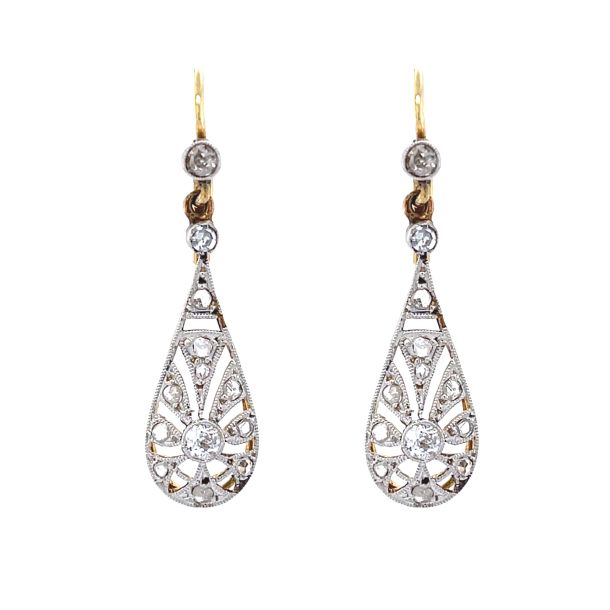 Art Deco Handmade 18ct Yellow Gold & Platinum Tear Drop Design Diamond Drop Earrings
