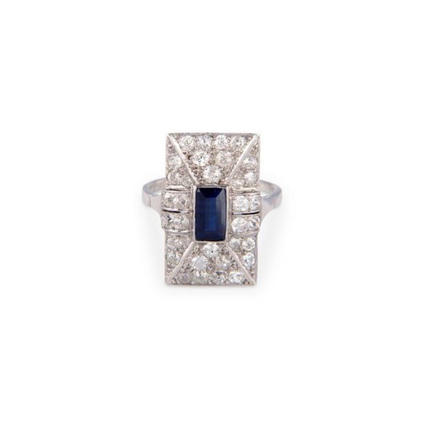ART DECO PLATINUM RING WITH CUSHION CUT SAPPHIRE