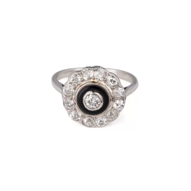 Art Deco 18ct White Gold Diamond and Onyx Daisy Cluster Ring