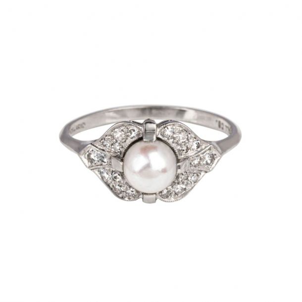 ART DECO PLATINUM, AKOYA PEARL AND DIAMOND RING